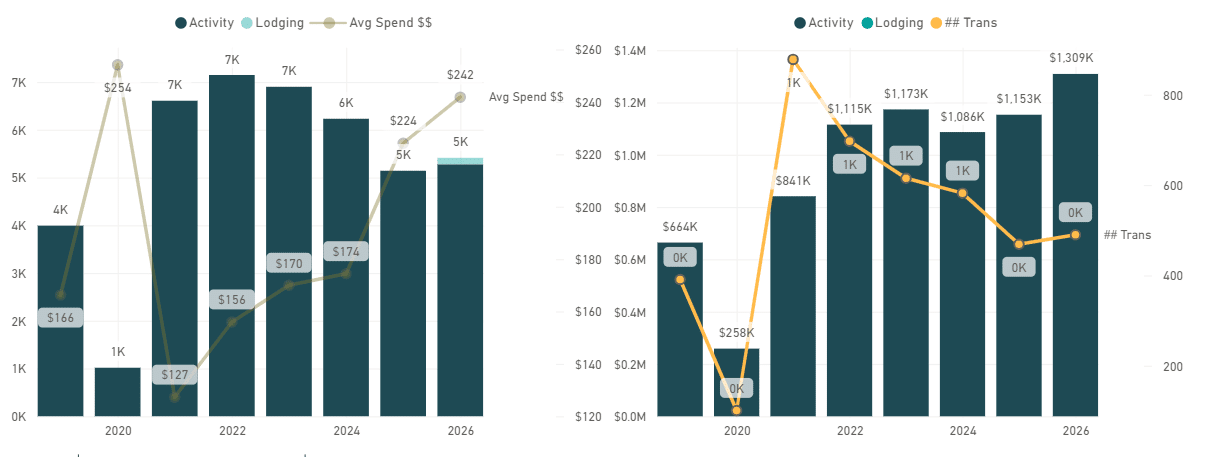 In Zebulon’s 10-outfit, nationwide sample, average spend is up meaningfully in several categories in 2026, including land-based and guided activities. Water-based activities are down slightly from 2025.